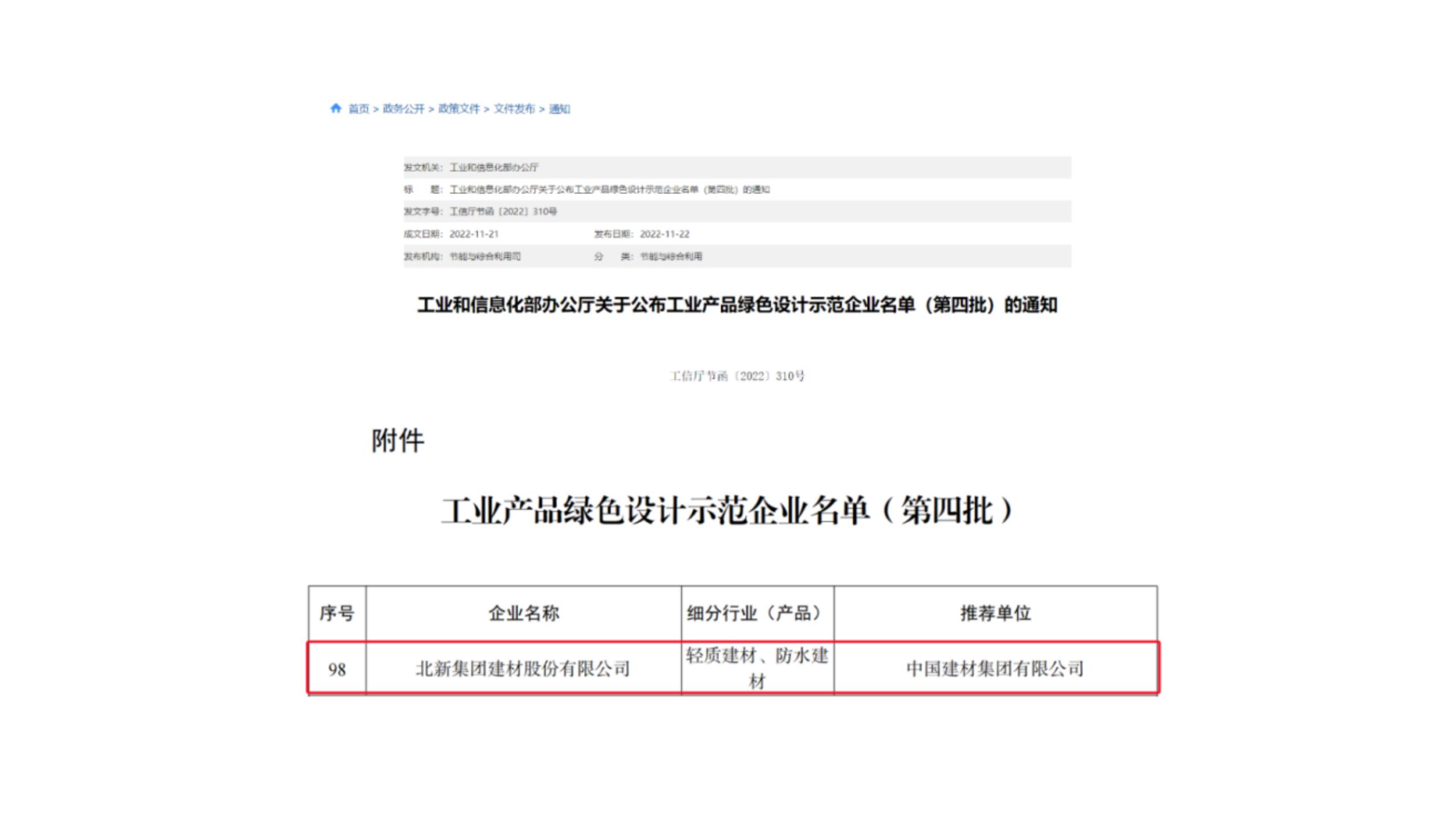 • 11月22日,工(gōng)業和信息化部公(gōng)布了第四批工(gōng)業産(chǎn)品綠色設計示範企業名(míng)單,北新(xīn)建材再添國(guó)家級榮譽——獲評“工(gōng)業産(chǎn)品綠色設計示範企業”。