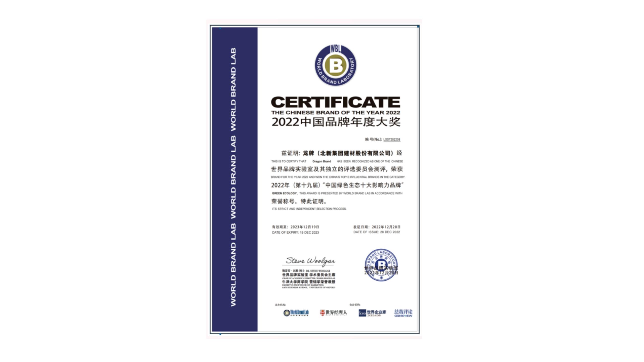 • 12月20日,北新(xīn)建材榮獲2022中(zhōng)國(guó)品牌年度大獎“中(zhōng)國(guó)綠色生态十大影響力品牌”,彰顯中(zhōng)國(guó)綠色新(xīn)材料行業的品牌力量。