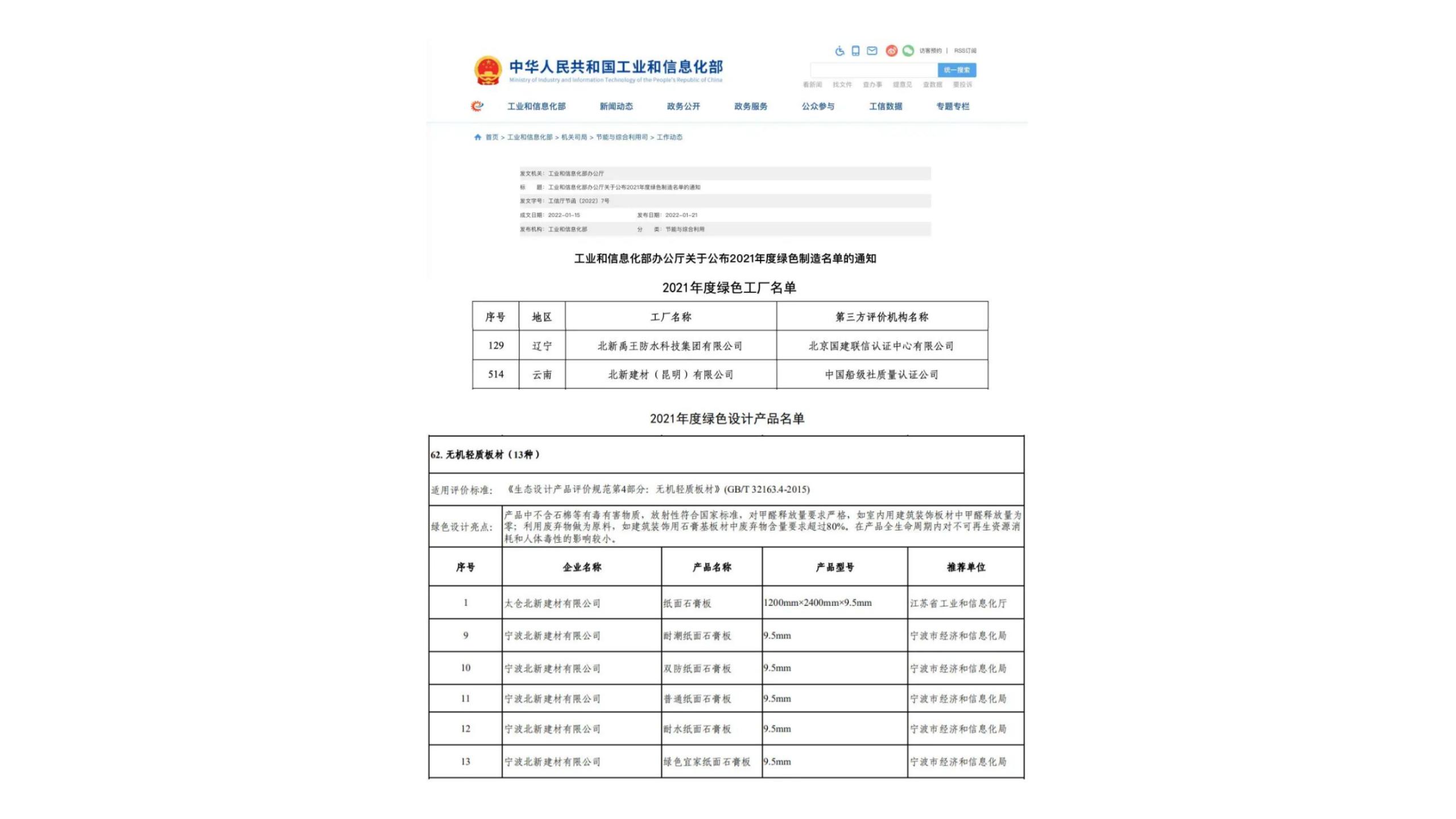 • 1月21日,工(gōng)信部發布“2021年度綠色制造名(míng)單”:北新(xīn)建材所屬昆明北新(xīn)、北新(xīn)禹王入選國(guó)家級“2021年度綠色工(gōng)廠名(míng)單”;太倉北新(xīn)龍牌紙面石膏闆,甯波北新(xīn)龍牌耐潮紙面石膏闆、雙防紙面石膏闆、普通紙面石膏闆、耐水紙面石膏闆、綠色宜家紙面石膏闆入選“2021年度綠色設計産(chǎn)品名(míng)單”。