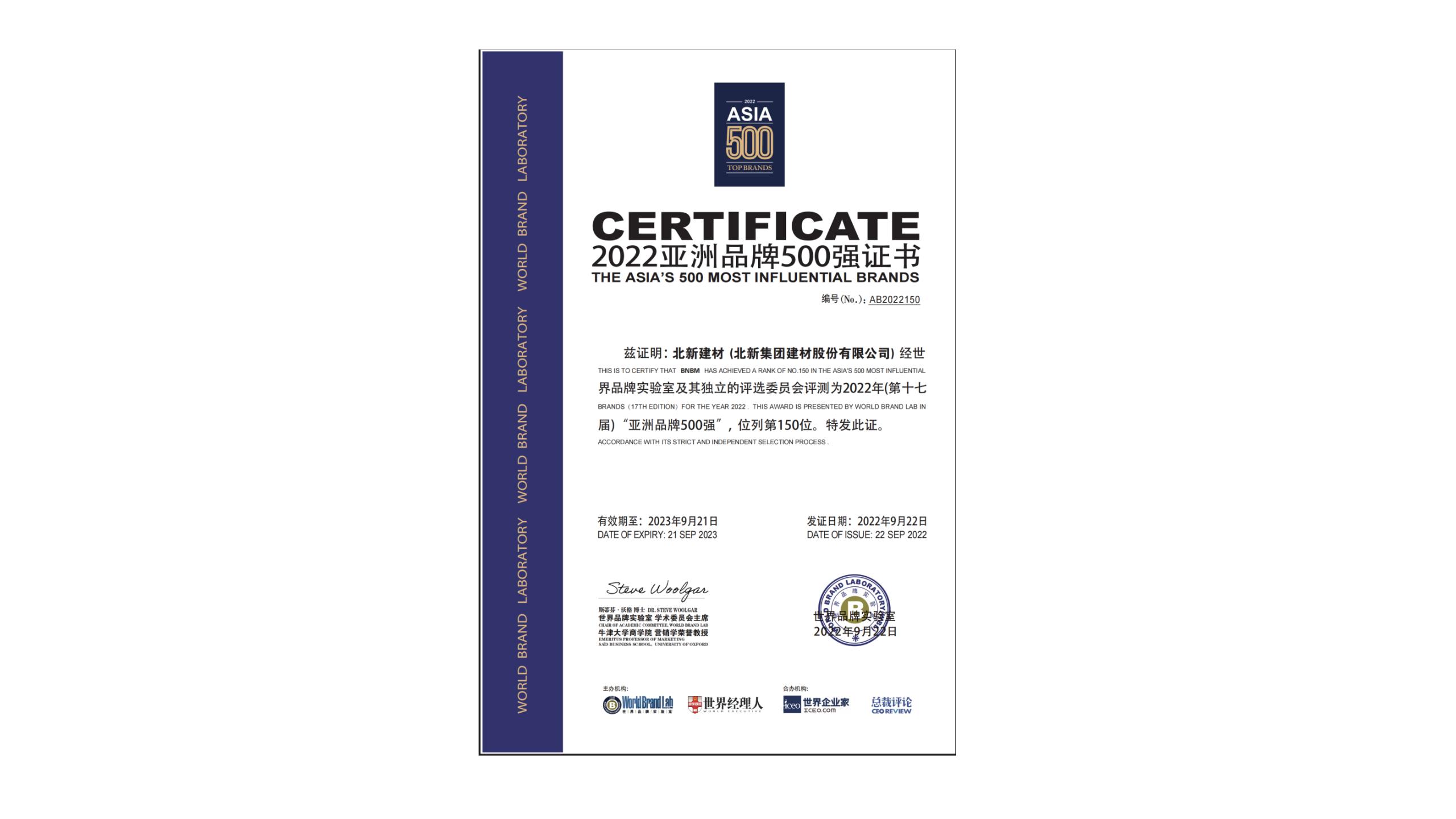 • 9月22日,2022年《亞洲品牌500強》排行榜揭曉,北新(xīn)建材名(míng)列第150位,排名(míng)前進2位,再次蟬聯亞洲建材品牌三強。