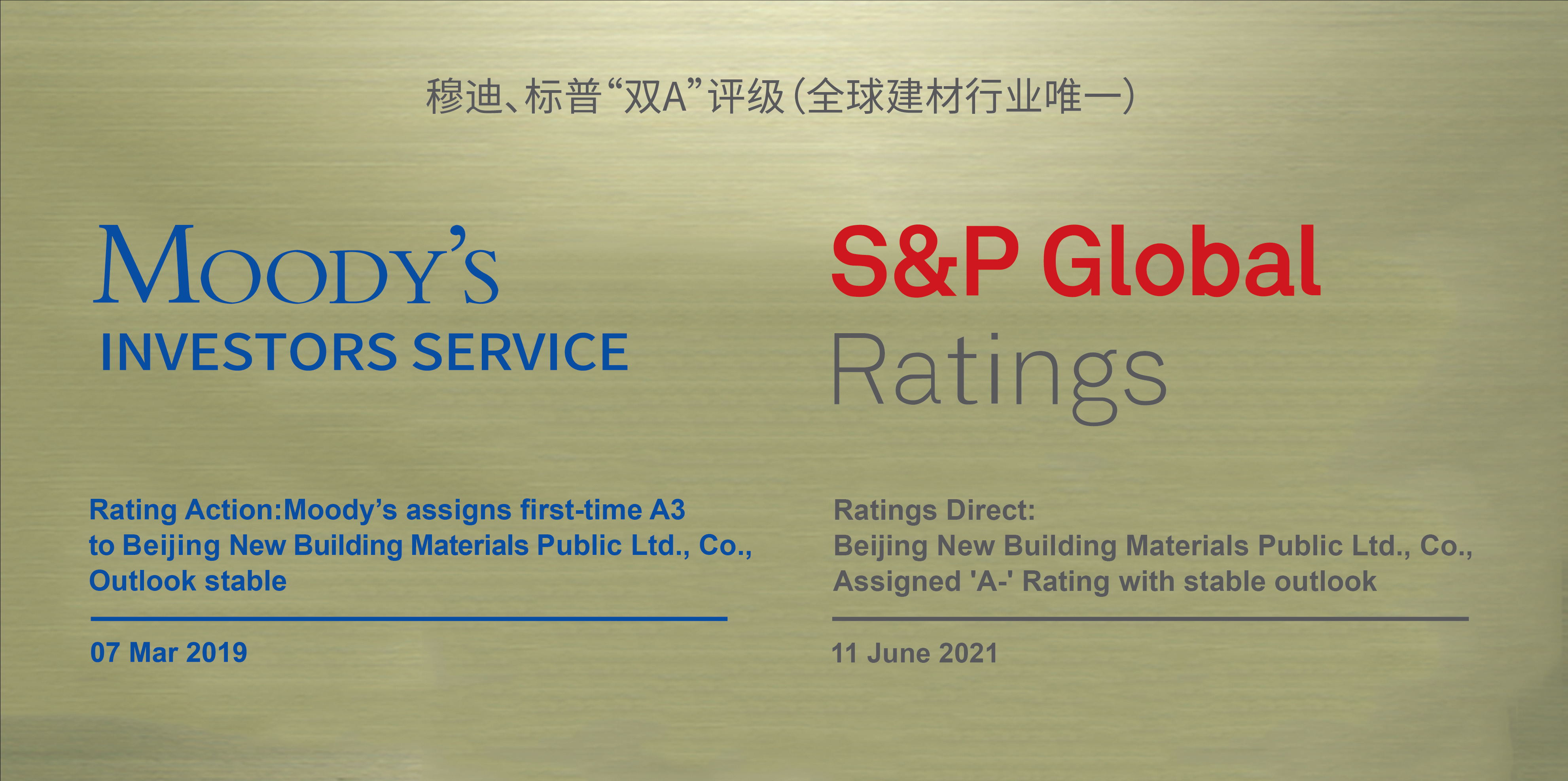 北新(xīn)建材分(fēn)别被穆迪、标普兩大全球權威評級機構授予A3和A-評級,成為(wèi)全球同行業最高評級。